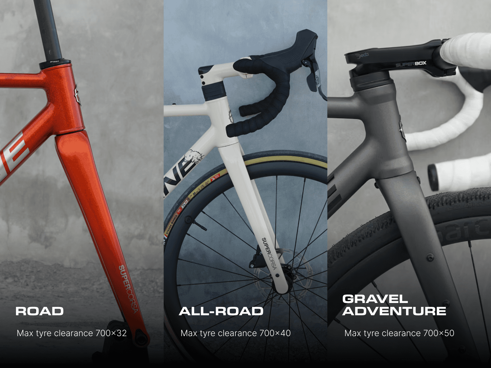 Fork options—Our Road fork (700x32 max tyre), All road fork (700x40 max tyre, fender mount), or Gravel Adventure fork (700x50 max tyre, triple side mount, fender mount, dynamo/front light combo mount), tapered steer tube, ISO 4120 tested